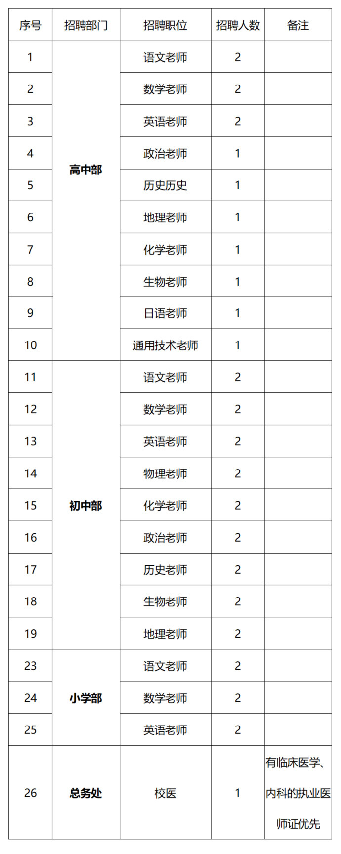 - 具有教师资格证书,并具有与任教学科相同或相关的大学本科及以上学历,有高中相关学科教学经验者、愿做能做班主任者优先。
